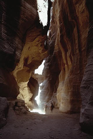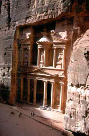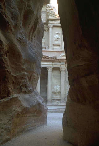 ![]() Zicht vanuit de kloof (the siq) naar het voorplein van de khazneh (of khaznah) |