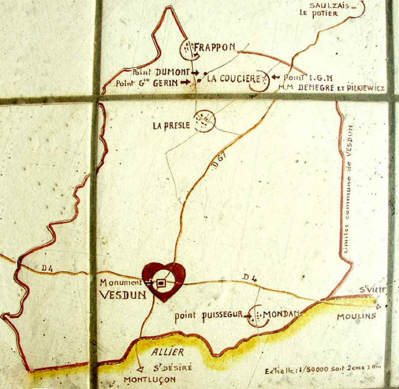 (de heer Puissegur, professor in de - 1984 (Jean Denegre en Claude Pilkiewicz, ingenieurs geografen van het IGN): bij La Coucière. Vesdun en de vier centrumplekken zijn aangegeven op de topografische kaart. Klik hier |
