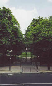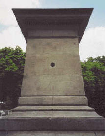 Sokkel Aragomonument en de zichtlijn naar het Observatorium. In de sokkel bevindt zich medaillon nr. 26. (foto's: J.Zeven, 2001)