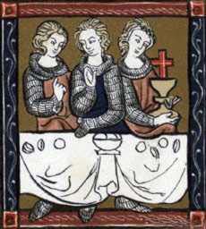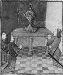 Galahad, Perceval en Bors bereiken de Graal. Manuscriptillustratie uit: Messire Lancelot du Lac. Frankrijk 15e eeuw.