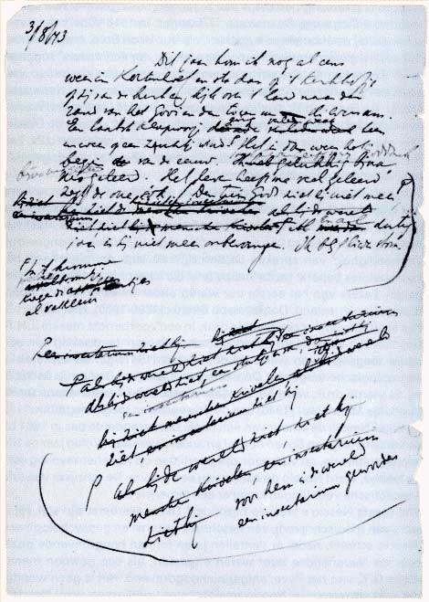 'De lamp hing als van ouds in 't midden van de kamer boven 't biljard. De lamp maakte als van ouds een reusachtige ronde schaduw op de lage balkenzoldering met een hel verlichte cirkel in 't midden. De Lancaster-gordijnen met de balletjesfranje, overdag bijna helemaal neer, die gordijnen waarom ik daar nooit logeeren wilde, hadden ze als van ouds tot op de vensterbank laten zakken. Als van ouds was 't er erg stil. Voor 't toonbankje stond een jong ventje, een van de vele Nederlandsche landschapschilders, dien ik wel eens meer gezien had en liet zich een bierfleschje vullen met advocaat. Hij was zoo lang weggebleven en moest z'n vrouw verzoenen. [...] Wij gingen aan een tafeltje bij 't raam zitten. De jeugdige landschapschilder vertrok met z'n fleschje advocaat, nadatti aan de juffrouw had uitgelegd datti zoo bizonder goed uit z'n hoofd kon schilderen. "Ook al een kunstenaar bij Gods genade", zei Bavink. "Ken je 'm?" vroeg ik. Bavink haalde z'n schouders op en liet den binnenkant van z'n handen zien. Toen wist ik 't al. "'k Heb 'm wel eens een aardig fluwelen jasje aan zien hebben. Hij drinkt wel aardig en liep vroeger met heel aardige meisjes." "En schildert ook wel aardig?" vroeg ik. "Miserabel", zei Bavink, "hij wordt miskend. Ze pesten 'm. Hij werkt met ingezonden stukjes in de krant."