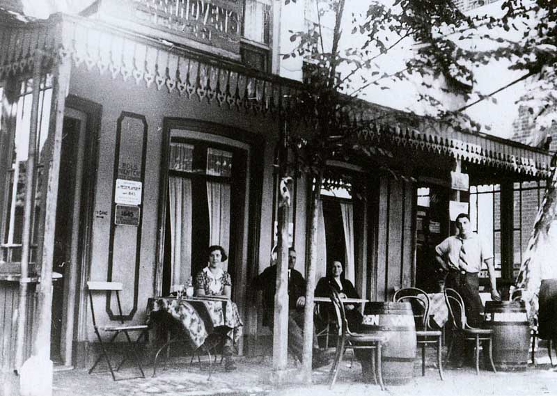Op oude foto's en tekeningen zie je een knus interieur met eenvoudige houten tafels en stoelen, een biljart en vele schilderijtjes aan de muur en zelfs op de deuren, zoals in de Herberg van Ganne in Barbizon. Het trapje leidde naar de raadskamer die tot 1910 in gebruik was als gemeentehuis.