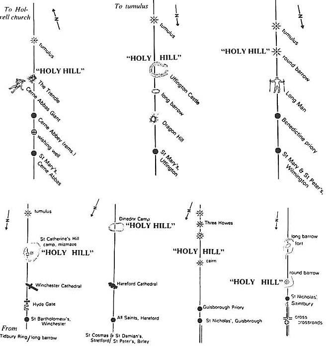 afb.10, Zeven heiligeheuvellijnen in Engeland, allen min of meer N-Z georiënteerd