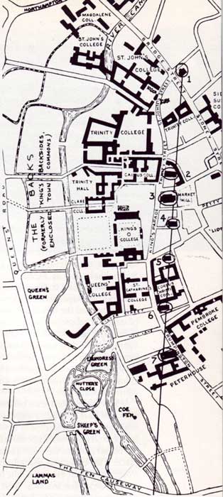 afb.5, Cambridge, lijn met daarop 7 middeleeuwse kerken.