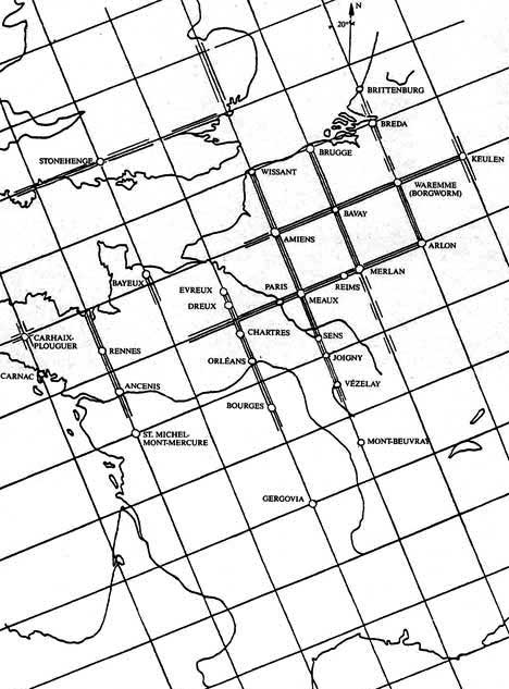 De prehistorische of nulmeridiaan, d.w.z. de basislijn Sens-Meaux-Amiens-Wissant,